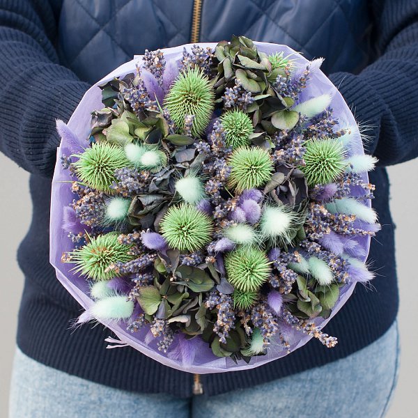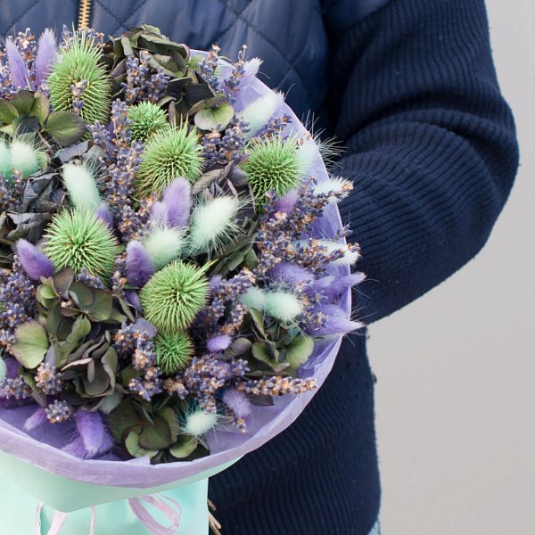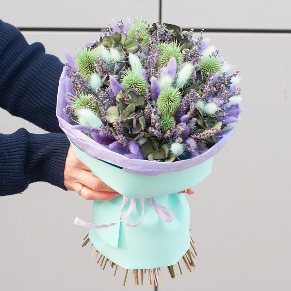 Букет выполнен в фиолетовом цвете, что придает ему изысканный и элегантный вид. В составе композиции вы найдете эрингиум, лаванду, лагурус и гортензию, которые гармонично сочетаются между собой и создают неповторимую атмосферу.