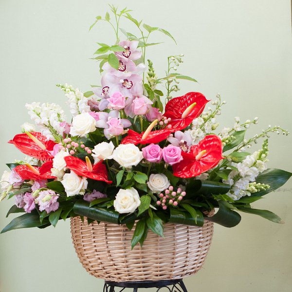 Корзина с цветами "Делюкс" - это изысканный и стильный подарок, который подойдет для любого повода и станет прекрасным дополнением к любому торжеству.