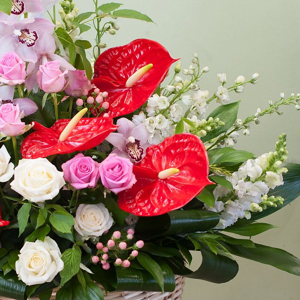 В состав композиции входят различные виды цветов, включая антуриум, орхидею, дельфиниум, эустому, розу, антиринум. Это позволяет создать яркий и насыщенный букет, который будет радовать глаз и вызывать восхищение.