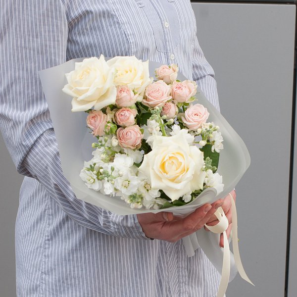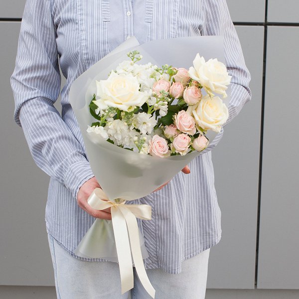 Букет состоит из трех видов цветов: розы, кустовой розы и маттиолы. Эти цветы символизируют любовь, нежность и заботу, что делает букет еще более привлекательным.
