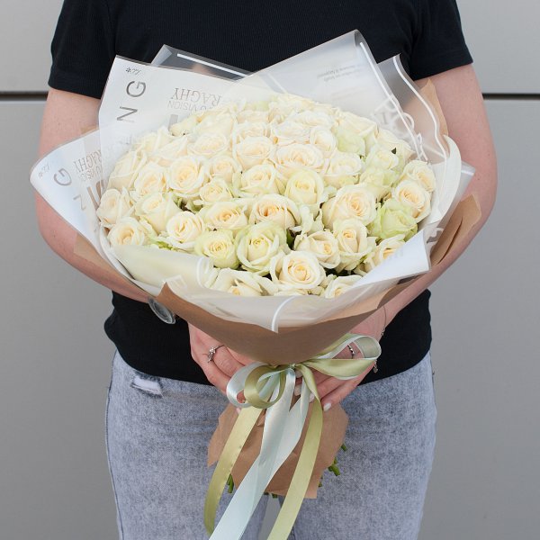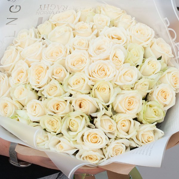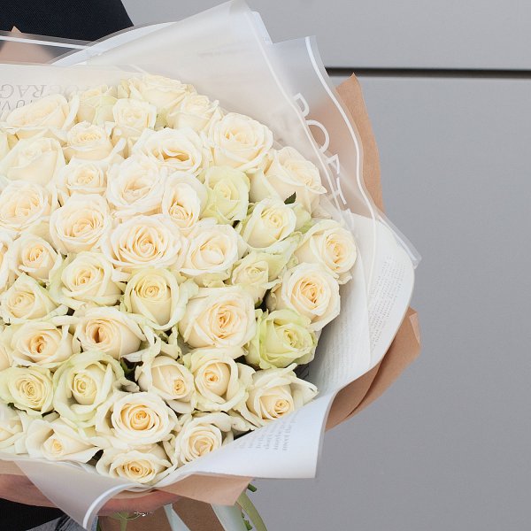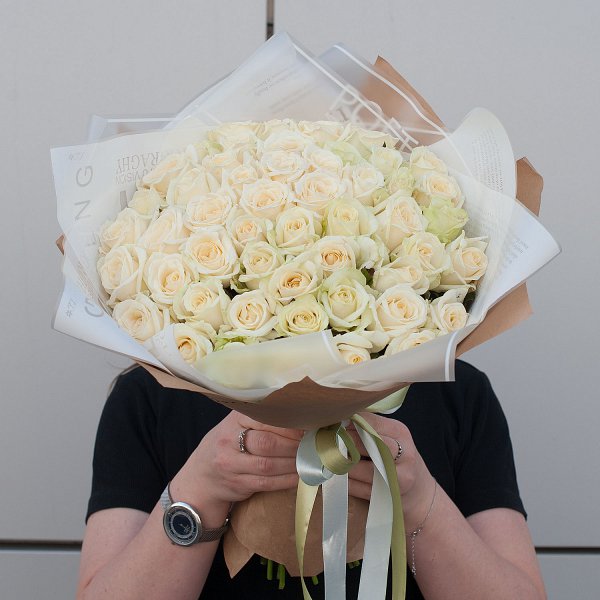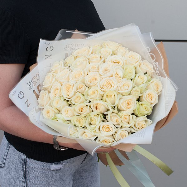 Букет цветов "Верена" - это элегантный монобукет, состоящий из 51 белой розы высотой 40 см.