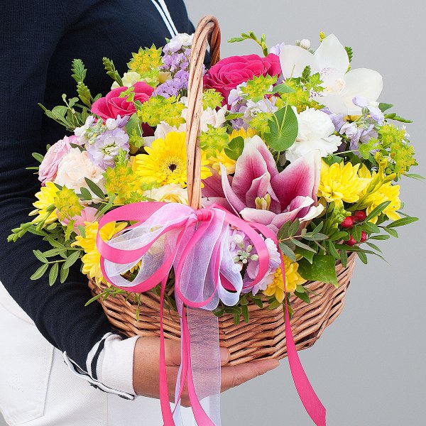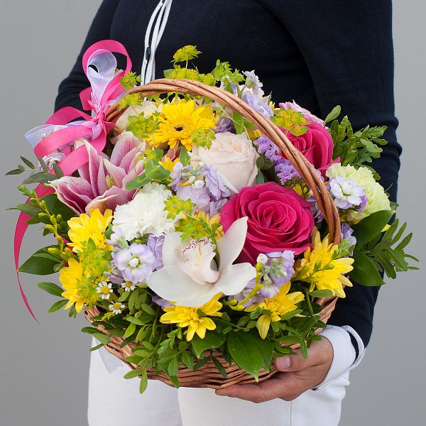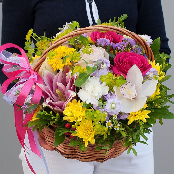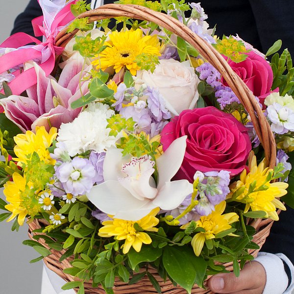Корзина с цветами "Мамбо" - это уникальное сочетание красоты и изящества.