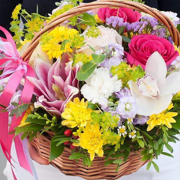 Букет состоит из 19 видов цветов, включая лилии, герберы, хризантемы, розы, орхидеи, гвоздики, статицы, маттиолы, буплерума, гиперикума и других. Такой разнообразный состав позволяет создать яркую и насыщенную композицию, которая будет радовать глаз и вызывать улыбку на лице.