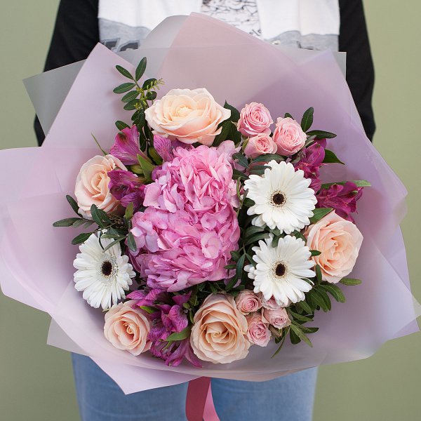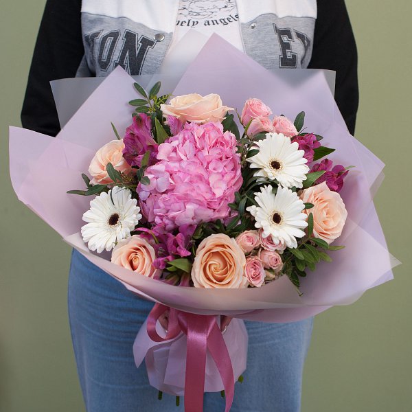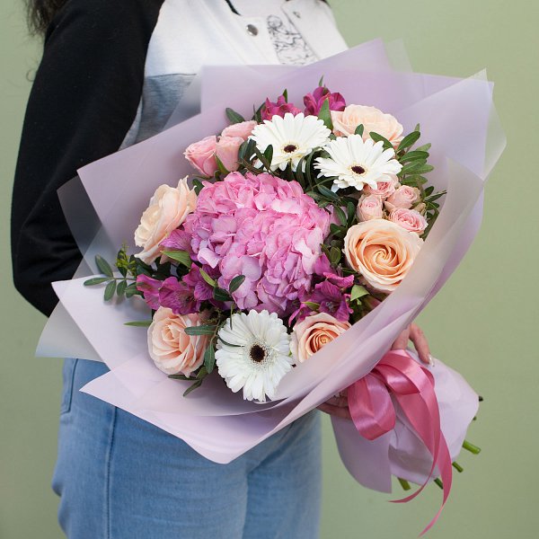 Букет цветов "Дочь рассвета" - это сборный букет, состоящий из пяти видов цветов: гортензии, розы, альстромерии, розы кустовой и гермини.