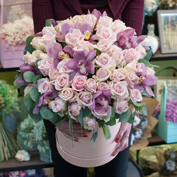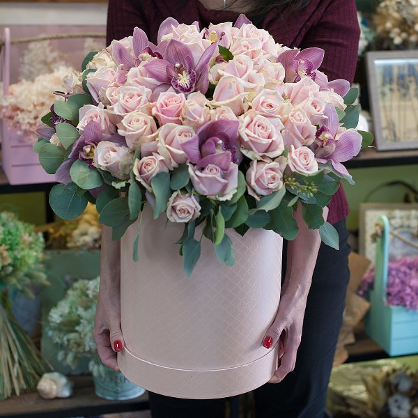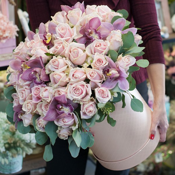 Шляпная коробка с цветами из нежно-розовых роз и розовых орхидей.
