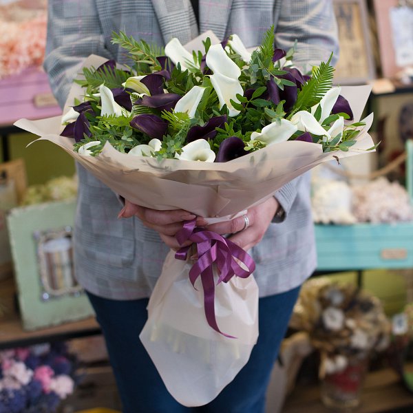 Букет из калл "Вермонт" - это уникальное сочетание белых и темно-фиолетовых калл, дополненное декоративной зеленью амбрелла и ветвями эвкалипта.
