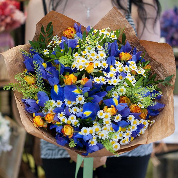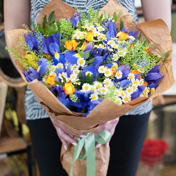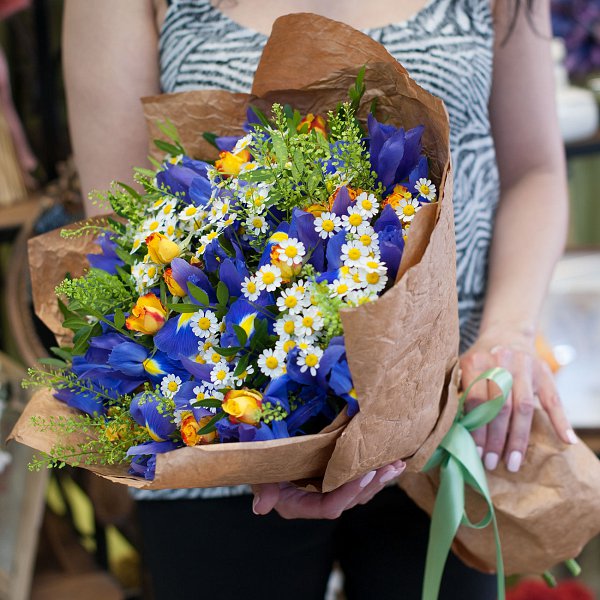 Букет в ярких тонах из синих ирисов, желто-красных кустовых роз, ромашки с декоративной зеленью, грин белл в дизайнерской бумаге крафт.
