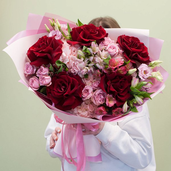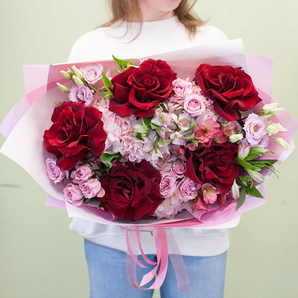 Букет цветов "Флер Амур" - это сборный букет, состоящий из 19 различных видов цветов. В его состав входят розы, гортензии, кустовые розы и альстромерии. Все цветы имеют красный цвет, что придает букету яркость и насыщенность.