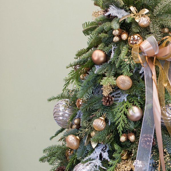 Елка украшена различными элементами декора: игрушками, лентами и шишками. Это придает ей еще больше очарования и делает ее по-настоящему праздничной.