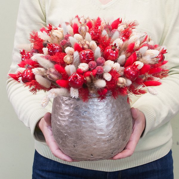 В комплект также входят засахаренные ягоды, декоративный гранат, аспарагус стабилизированный красный и папавер. Это позволяет создать еще более интересную и разнообразную композицию.