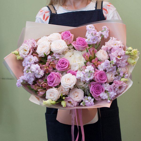 Букет состоит из 6 видов цветов: гортензии, розы, розы кустовой, альстромерии, эустомы и маттиолы. Такое разнообразие позволяет создать яркий и запоминающийся образ, который будет радовать получателя на протяжении долгого времени.