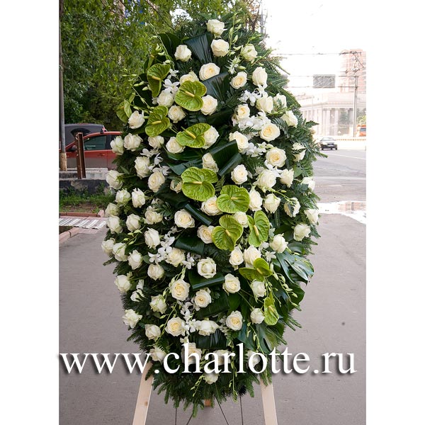 Траурный венок из белых роз, белых орхидей, зеленого антуриума с декоративной зеленью.