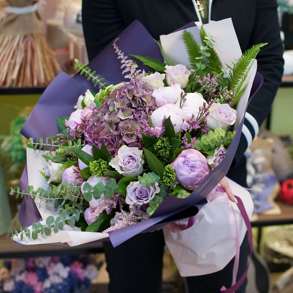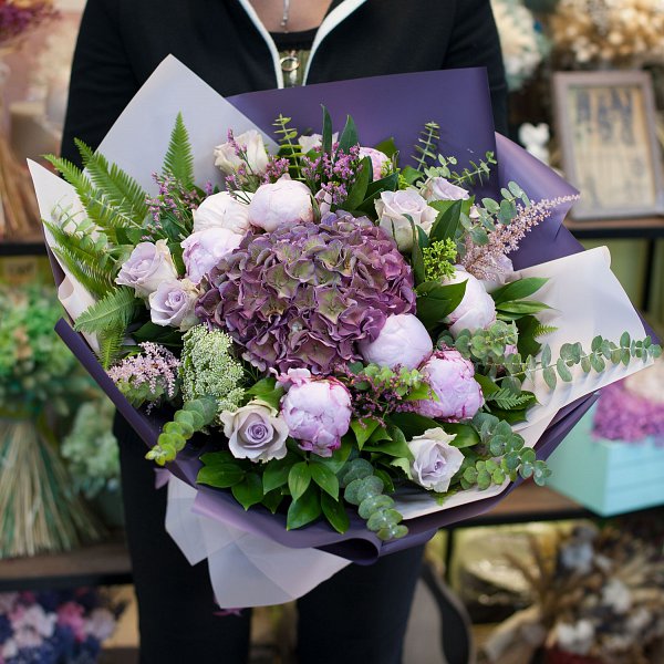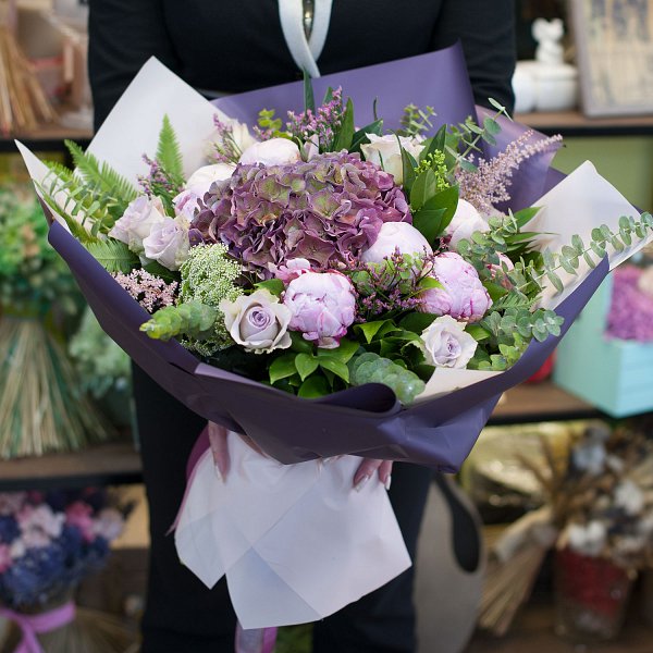 Букет в розово-фиолетовых тонах из гортензий, пионв, роз, астильбы, лимониума с декоративной зелени в подарочной упаковке.