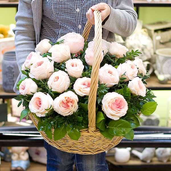 Корзина из нежнейших с приятным запахом пионовидных роз с декоративной зеленью. По Вашему желанию цветовую гамму композиции можно изменить, для этого звоните в наши салоны цветов или указывайте в разделе "комментарии для флориста" при заказе через интернет.