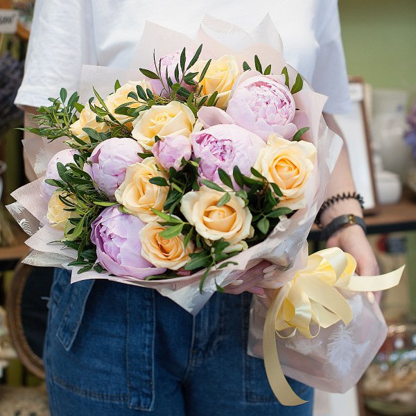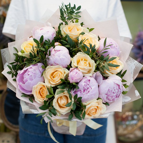 Букет из пионов и роз "Hanna" - это изысканный и стильный подарок, который станет незабываемым сюрпризом для любого случая.