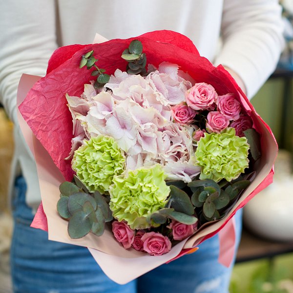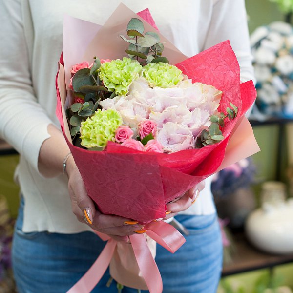 Букет цветов из розовой гортензии, зеленой гвоздики, кустовых роз с эвкалиптом в дизайнерской упаковке.