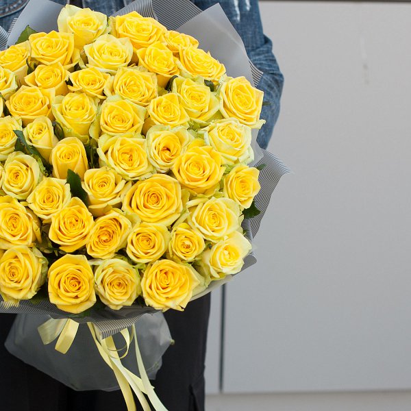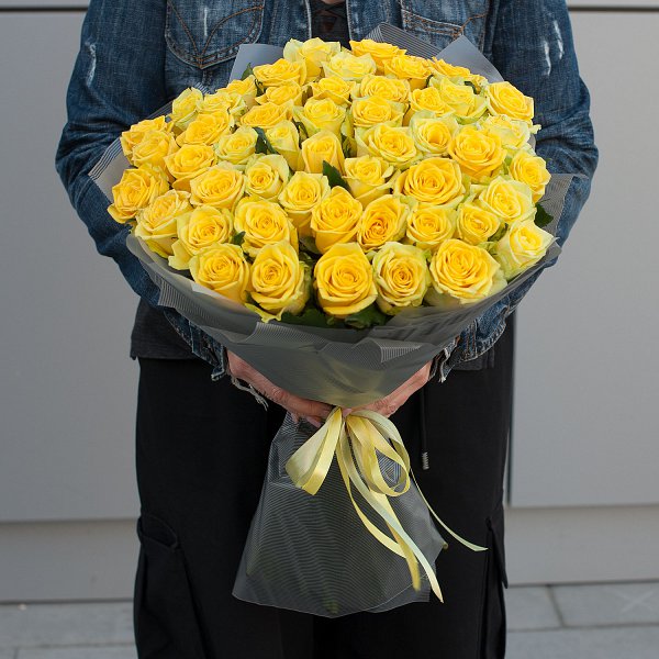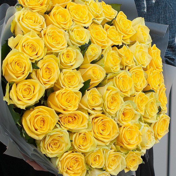 Букет состоит из 49 желтых роз, собранных на стеблях. Это придает букету объем и пышность, делая его ярким и запоминающимся.