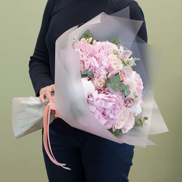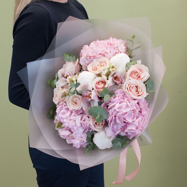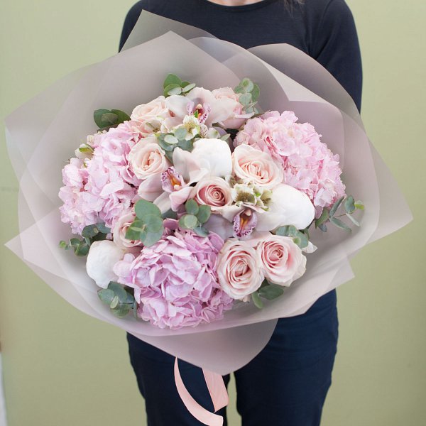 Букет выполнен в нежных тонах, сочетающих в себе розы, альстромерии, орхидеи, гортензии и пионы. Такой состав цветов создает неповторимую атмосферу и подчеркивает индивидуальность получателя.