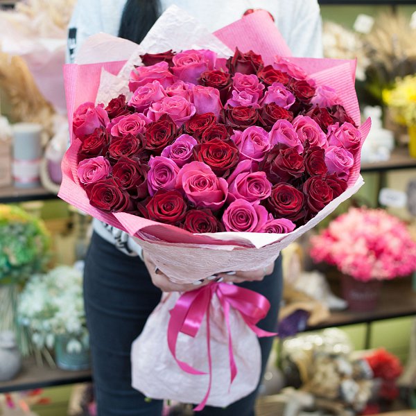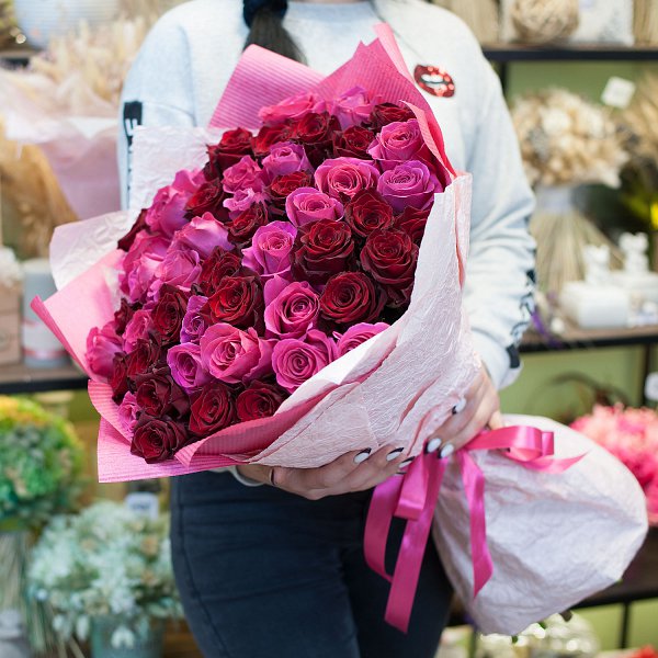 Яркий, красочный насыщенный букет из эквадорских крупноголовых роз премиум класса в дизайнерской упаковке.