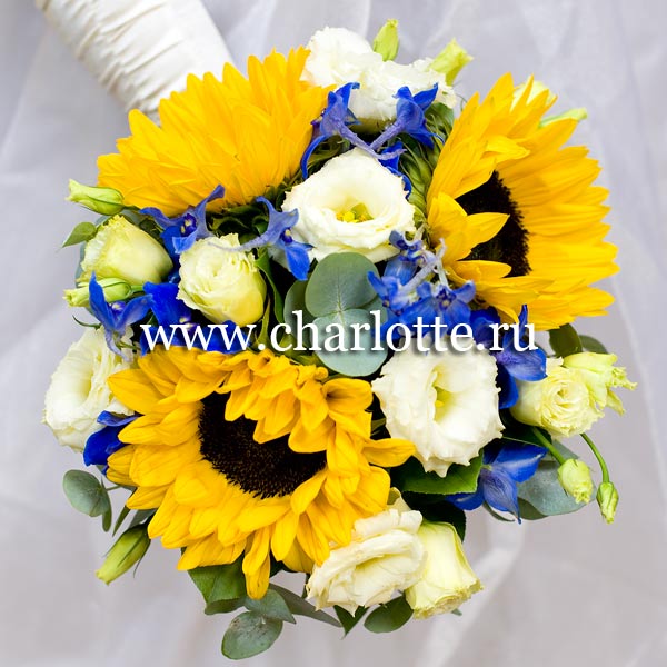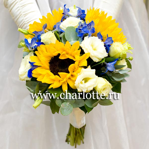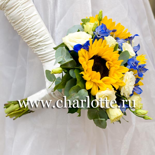 Букет невесты из подсолнухов, дельфиниумов, лизиантусов с декоративной зеленью.