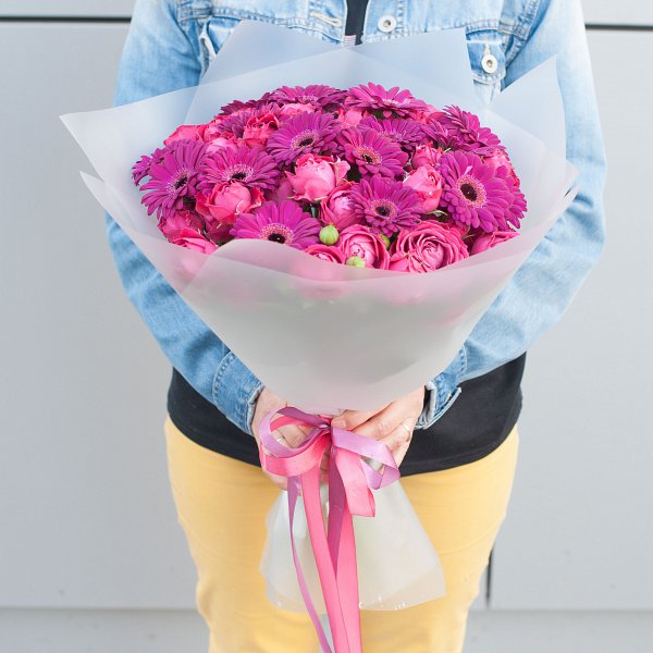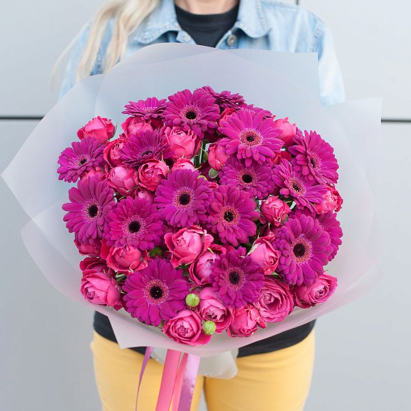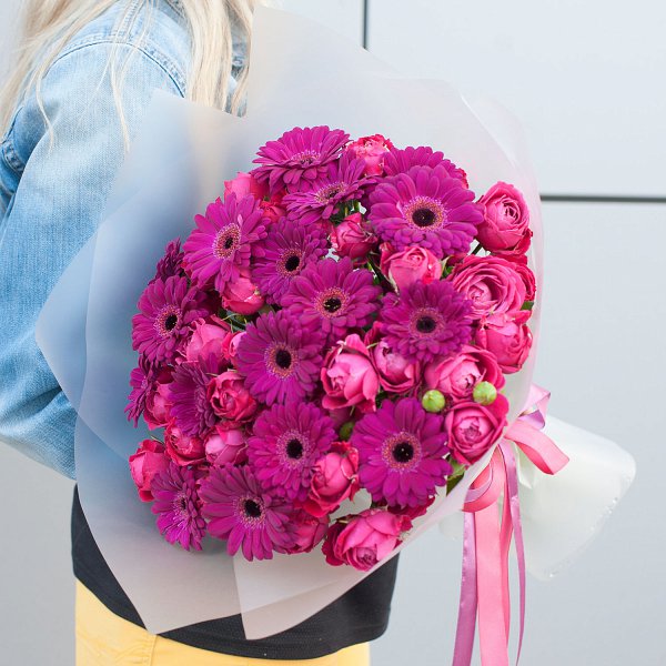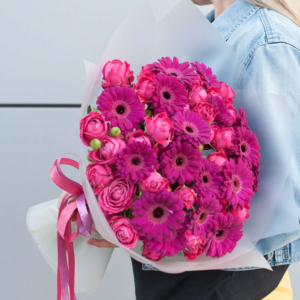Особенностью этого букета является его состав. В нем представлены три вида цветов: минигербера, роза кустовая и роза пионовидная. Такое сочетание делает букет ярким и насыщенным, а также придает ему неповторимый аромат.