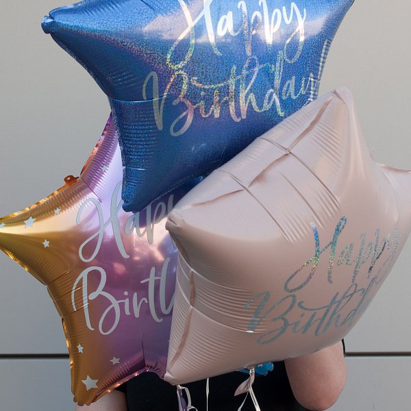 Букет состоит из трех разноцветных воздушных шаров в форме звезд, выполненных из фольги. Это придает им глянцевый и матовый эффект, что делает их еще более привлекательными и яркими.
