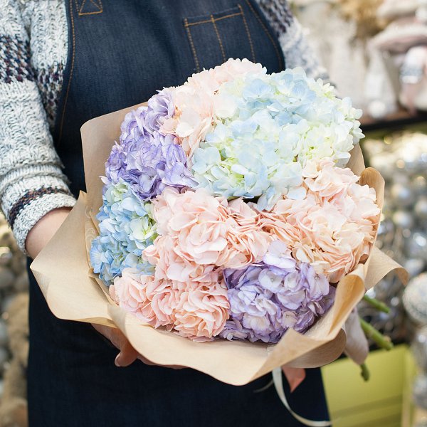 Букет из разноцветных гортензий (7 шт) в бумаге крафт.