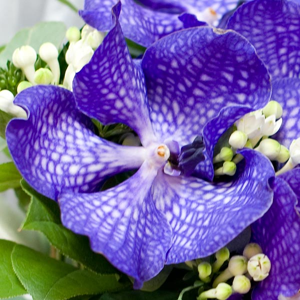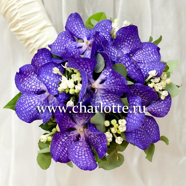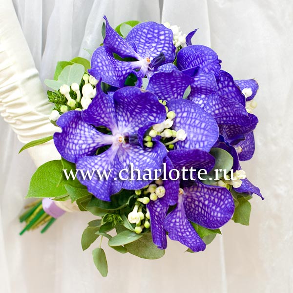 Букет невесты из орхидей Ванда сорта "Blue magic", белой бовардии с декоративной зеленью и лентой. По Вашему желанию цветовую гамму букета можно изменить, для этого звоните в наши салоны цветов или указывайте в разделе "комментарии для флориста" при заказе через интернет.