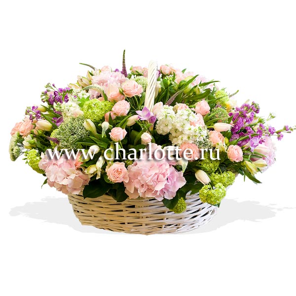 Огромная корзина в нежных тонах из гортензий, кустовых роз, матиолы, трахелиума, альстромерий, фрезий, тюльпанов, вибурнума с декоративной зеленью. По Вашему желанию цветовую гамму корзины можно изменить, для этого звоните в наши салоны цветов или указывайте в разделе "комментарии для флориста" при заказе через интернет.