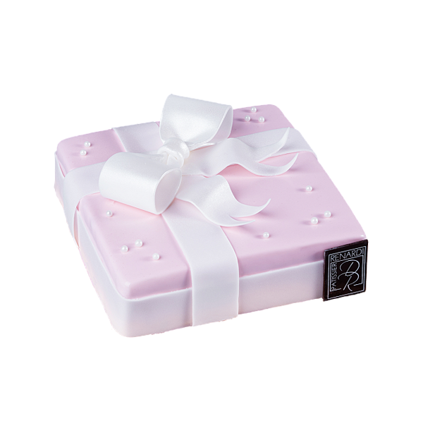 Миндально-фундучный бисквит, три слоя воздушного мусса из белого, молочного и черного шоколада с сыром «креметта» с натуральными сливками. Покрыт шоколадным гляссажем, украшен бантом из сахарной глазури. й.