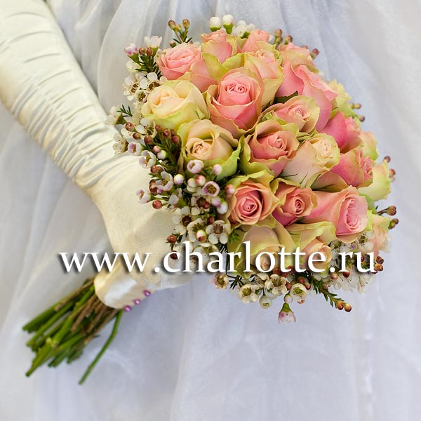 Букет невесты из зелено-розовых роз, белого восковника. По Вашему желанию цветовую гамму букета можно изменить, для этого звоните в наши салоны цветов или указывайте в разделе "комментарии для флориста" при заказе через интернет.