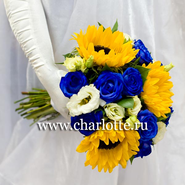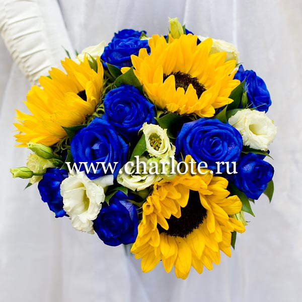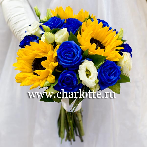 Букет невесты из подсолнухов, синих роз, лизиантусов с декоративной зеленью и лентой. По Вашему желанию цветовую гамму можно изменить, для этого звоните в наши салоны цветов или указывайте в разделе "комментарии для флориста" при заказе через интернет.
