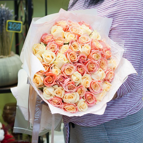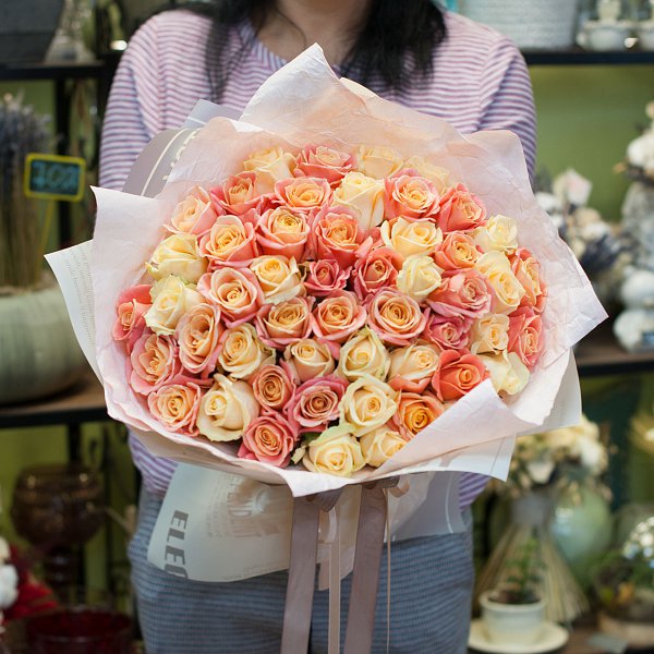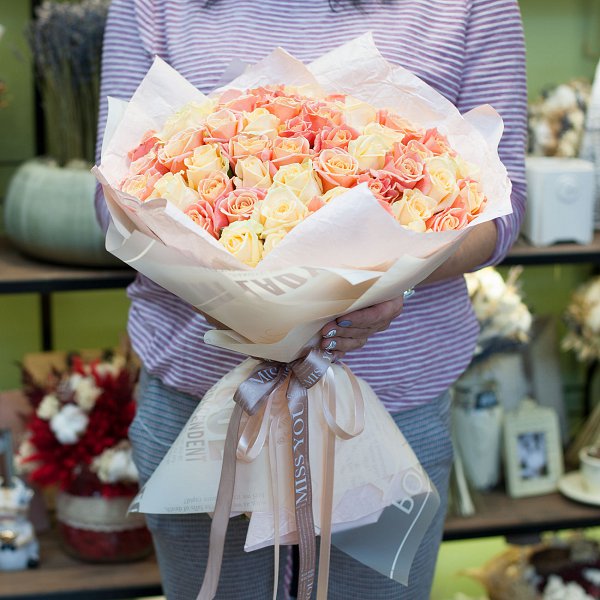 Букет из роз персиковых цветов разных оттенков в подарочной упаковке.
