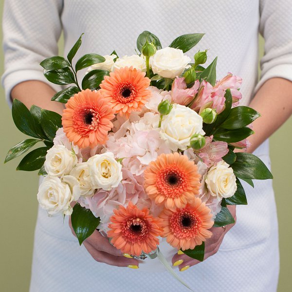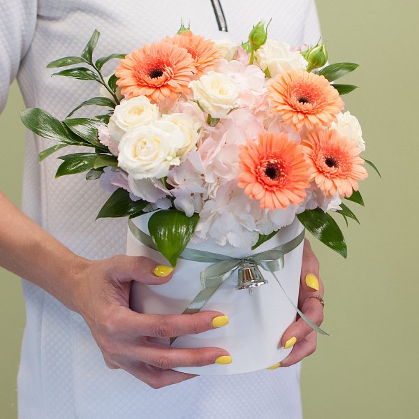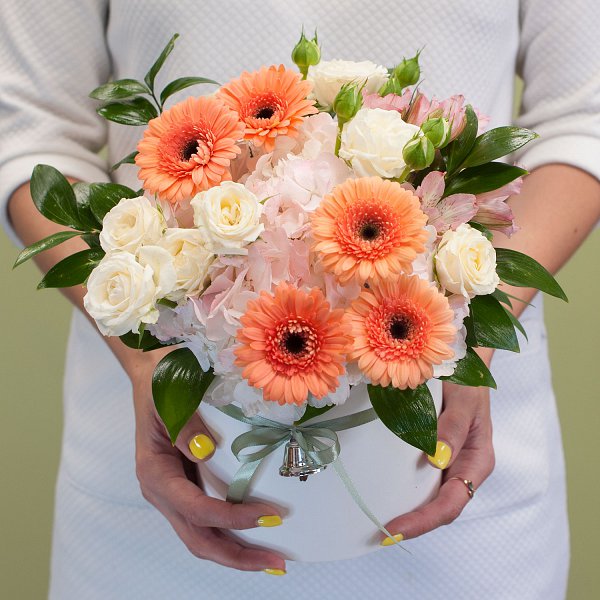 Шляпная коробка из минигербер, гортензии, кустовых роз, альстромерии с декоративной зеленью и декором.