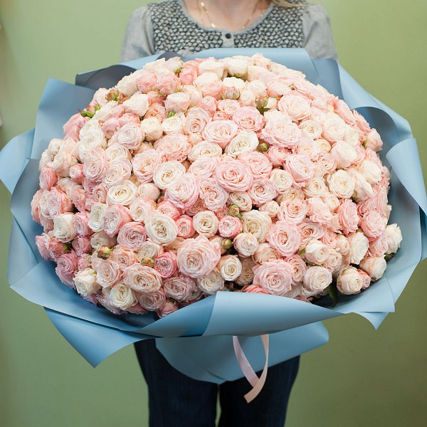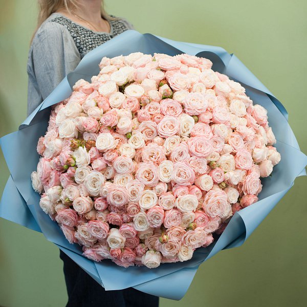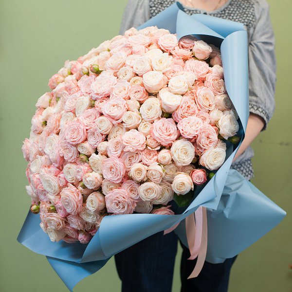 Букет из пионовидной кустовой розы сорта "Леди бомбастик" в дизайнеской упаковке.