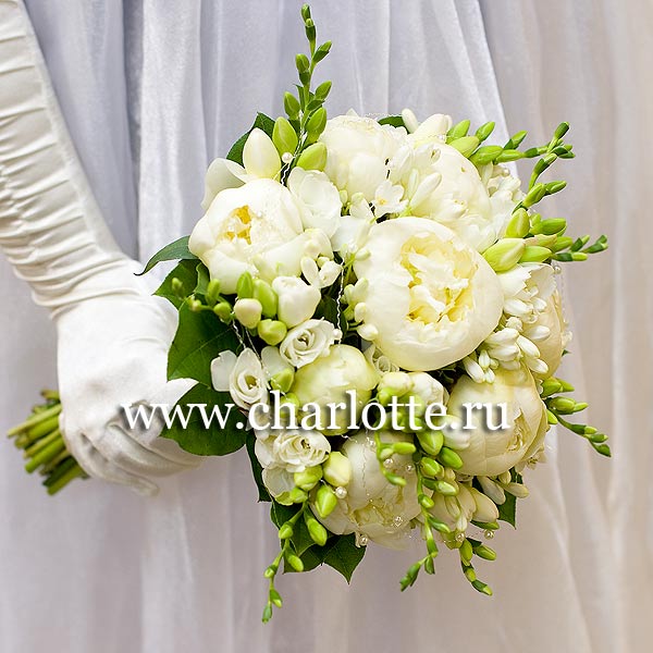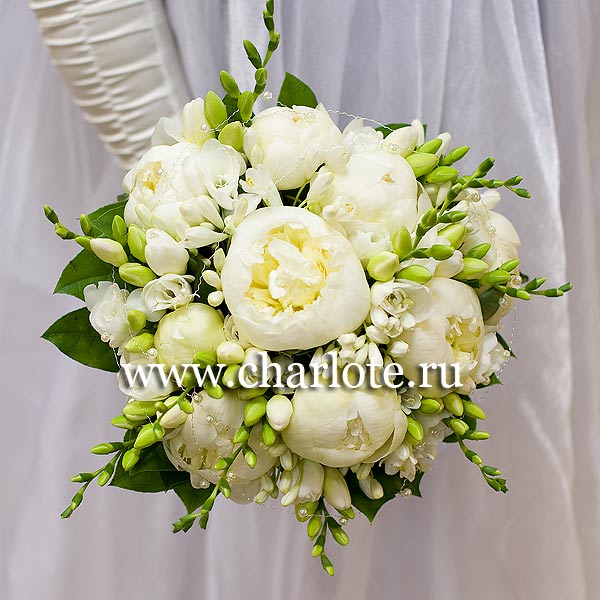 Букет невесты в белых тонах из пионов, фрезий, анигозантусов с декоративной зеленью и лентой.