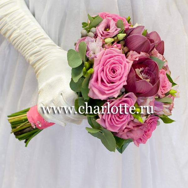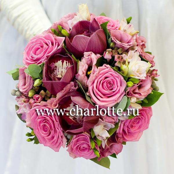 Букет невесты из роз, орхидей, фрезий, лизиантусов, бовардии, брунии, эвкалипта с лентой. По Вашему желанию цветовую гамму букета можно изменить, для этого звоните в наши салоны цветов или указывайте в разделе "комментарии для флориста" при заказе через интернет.