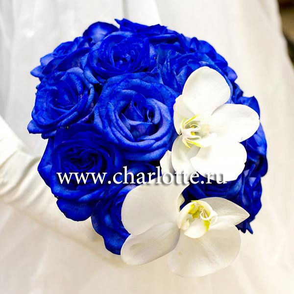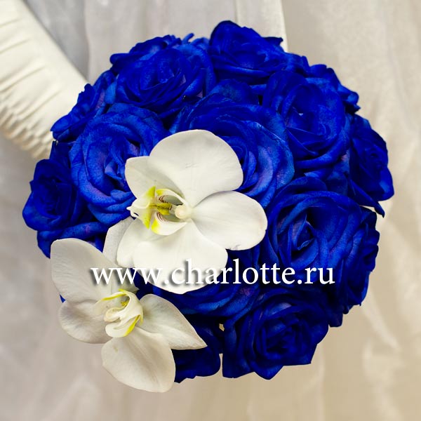 Букет невесты из синих роз и орхидей фаленопсис на портбукетнице. По Вашему желанию цветовую гамму букета можно изменить, для этого звоните в наши салоны цветов или указывайте в разделе "комментарии для флориста" при заказе через интернет.