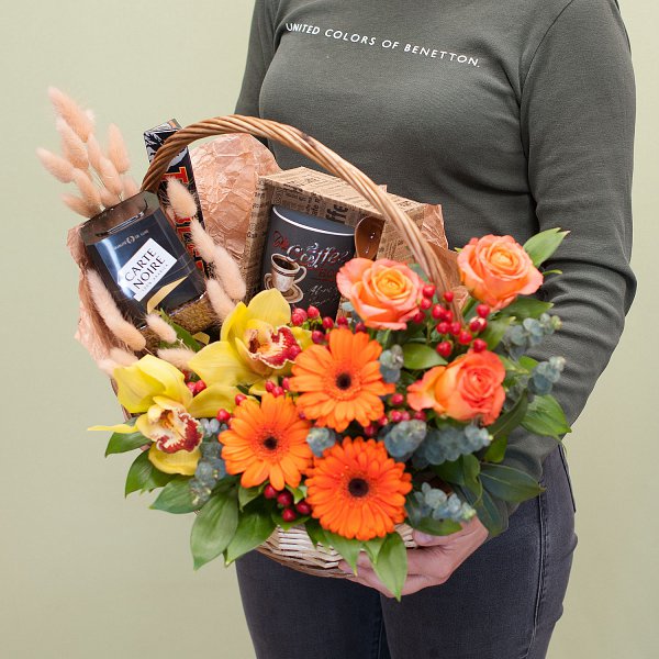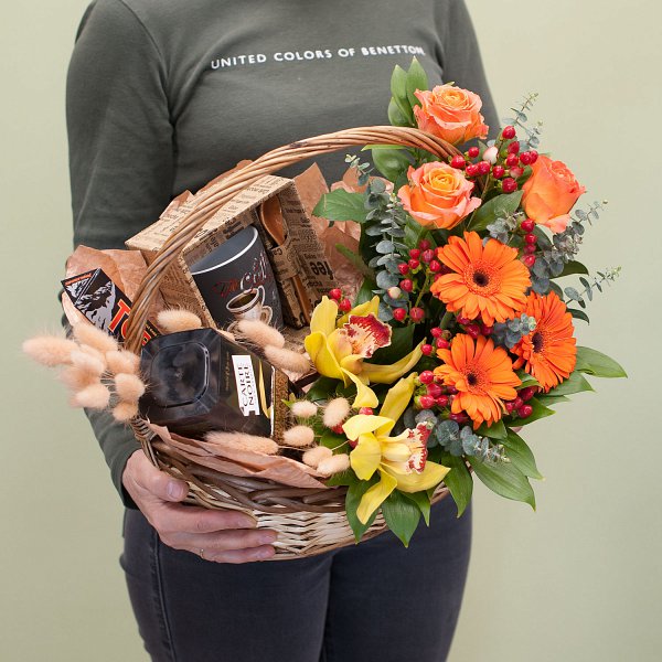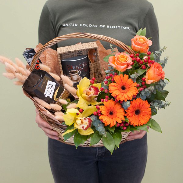 Корзинка с цветами, а так же кофе, шоколадом и керамической чашкой в оранжевой гамме.