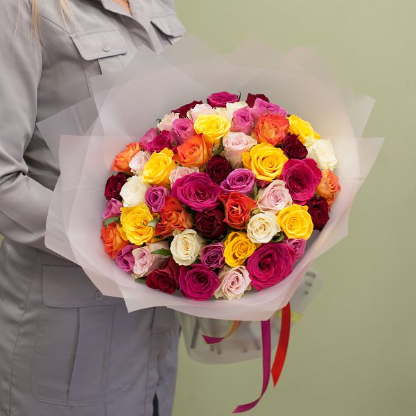 Букет из разноцветных коротких роз в упаковке "крафт"