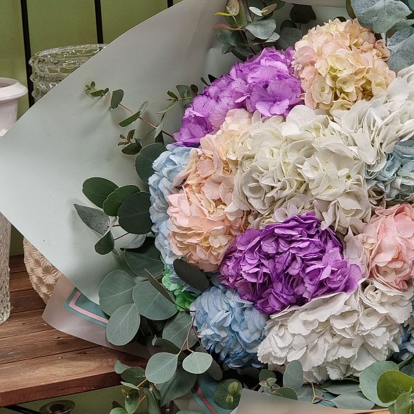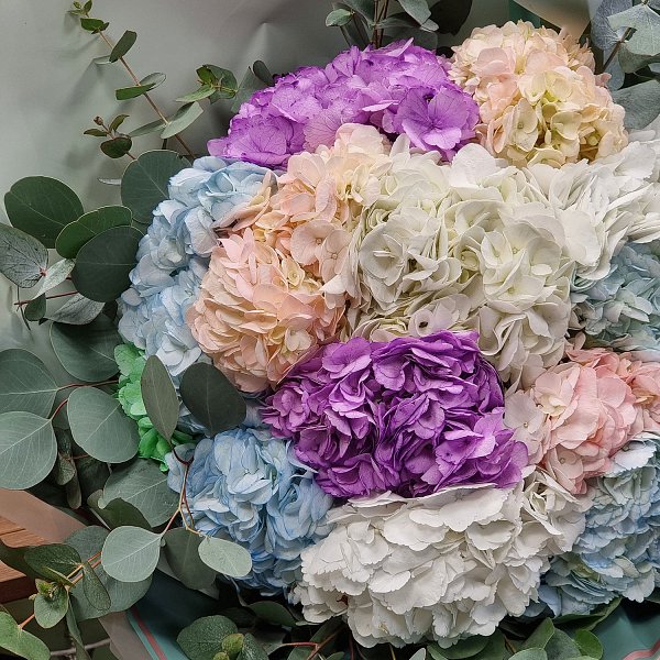Букет из разноцветных гортензий с эвкалиптом в дизайнерской упаковке.