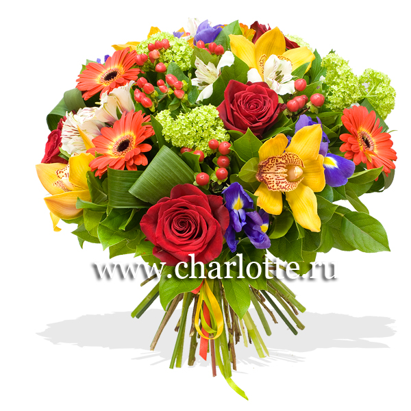 Букет в ярких тонах из роз, гермини, ирисов, орхидей, альстромерий, гиперикума, калины с декоративной зеленью. По Вашему желанию цветовую гамму букета можно изменить, для этого звоните в наши салоны цветов или указывайте в разделе "комментарии для флориста" при заказе через интернет.