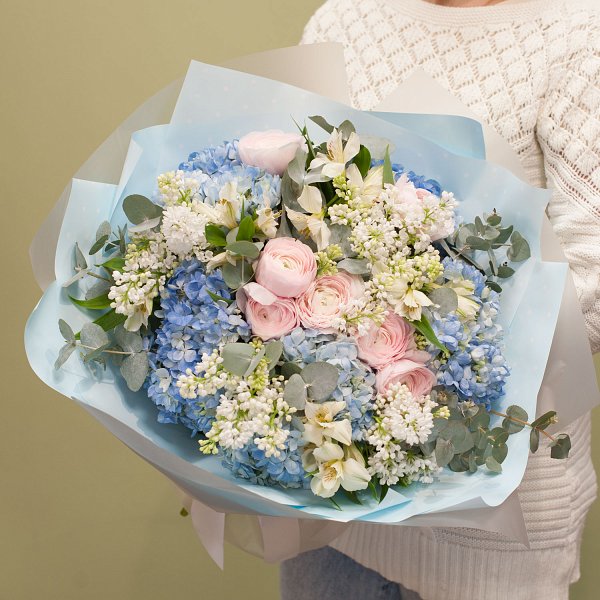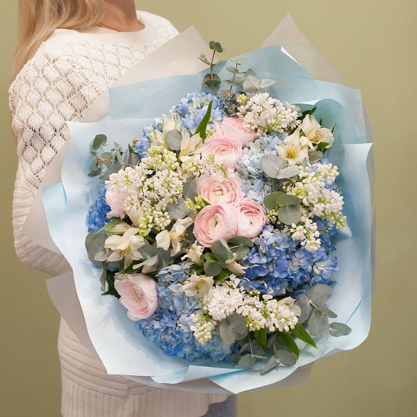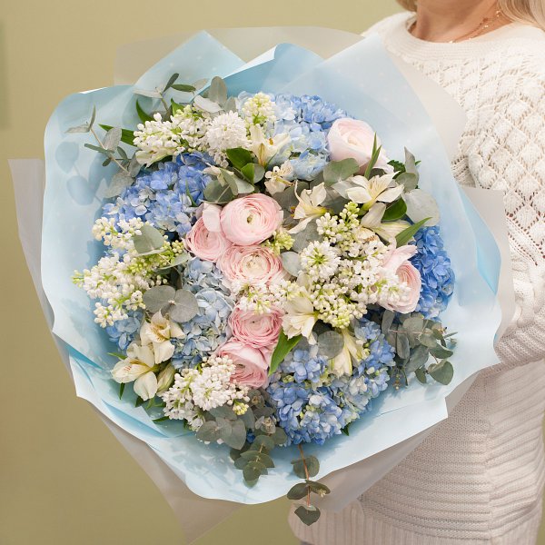Букет из голубой гортензии, белой сирени, эвкалипта, розовых ранункулусов, белой альстромерии в дизайнерской упаковке.