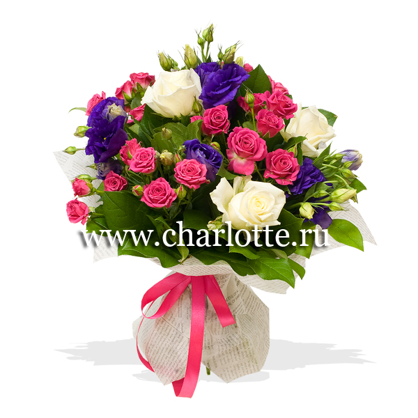 Букет в ярких тонах из роз, кустовых роз, лизиантусов с декоративной зеленью в подарочной упаковке. По Вашему желанию цветовую гамму букета можно изменить, для этого звоните в наши салоны цветов или указывайте в разделе "комментарии для флориста" при заказе через интернет.