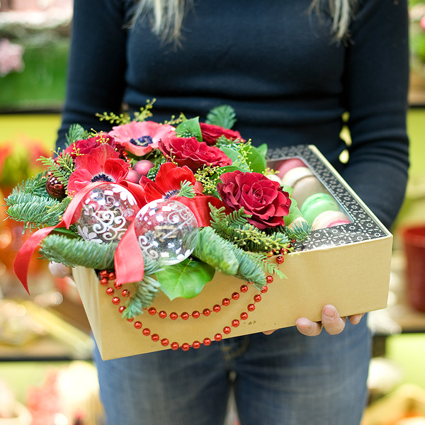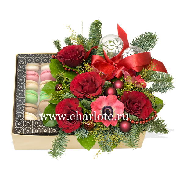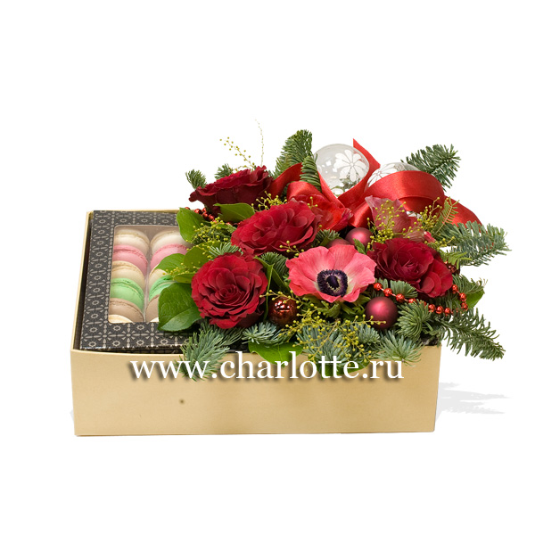 Подарочная коробка с цветами и макарунами, с еловым лапником и новогодними игрушками в красных нонах. По Вашему желанию цветовую гамму композиции можно изменить, для этого звоните нашими операторам по телефону или указывайте в разделе "комментарии для флориста" при заказе через интернет.