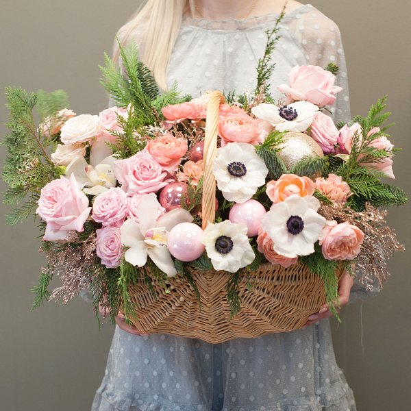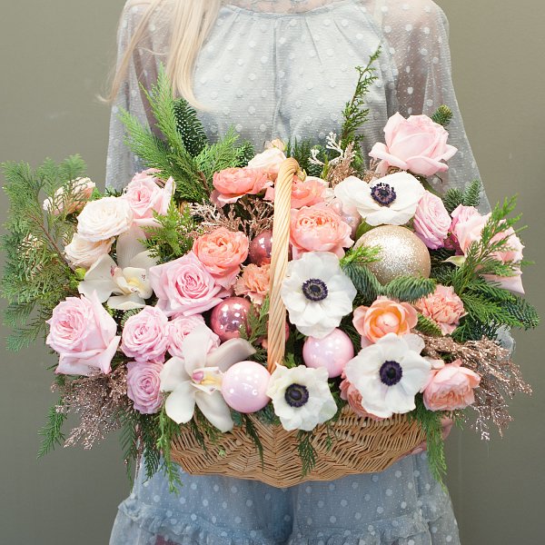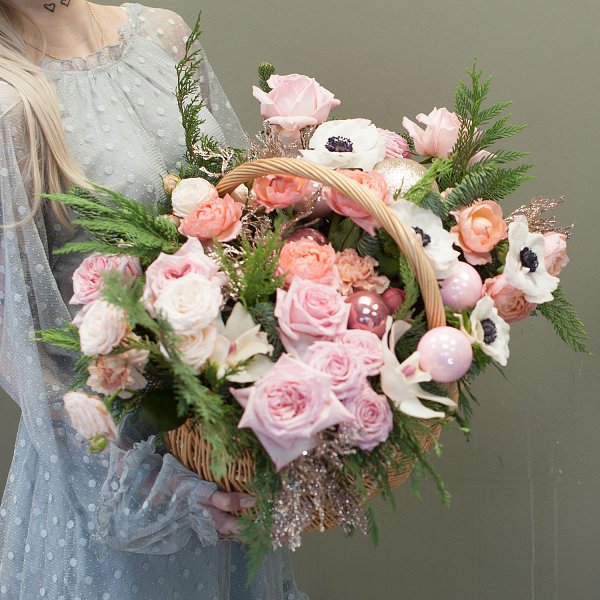 Новогодняя корзина из кустовых роз, анемонов с еловым лапником и новогодним декором "Перламутровый иней" - это уникальное и стильное решение для подарка на любой праздник.