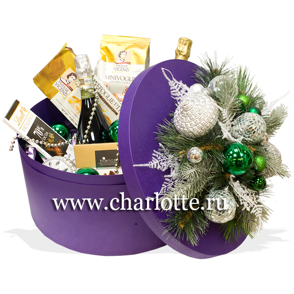 Корзина выполнена из прочного материала и украшена зеленью туи, кипариса и еловым лапником. Это придает композиции объем и создает атмосферу зимнего леса.
