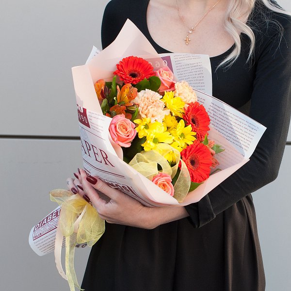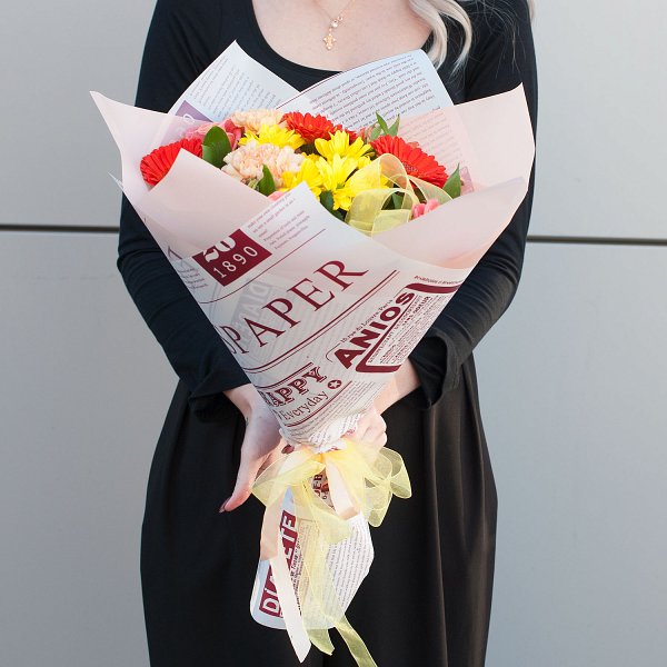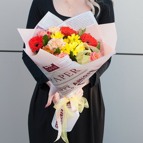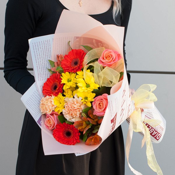 В составе букета - 3 розы, 3 минигерберы, 1 кустовая хризантема, 2 гвоздики, 2 альстромерии и 1/3 пачки листьев салала. Сборка букета осуществляется на стеблях, что обеспечивает его устойчивость и долговечность.