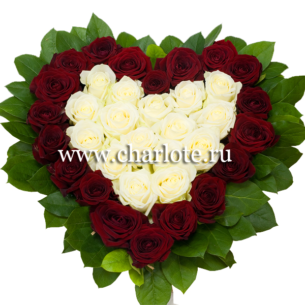 Сердце из красных и белых роз с декоративной зеленью. По Вашему желанию цветовую гамму композиции можно изменить, для этого звоните в наши салоны цветов или указывайте в разделе "комментарии для флориста" при заказе через интернет.