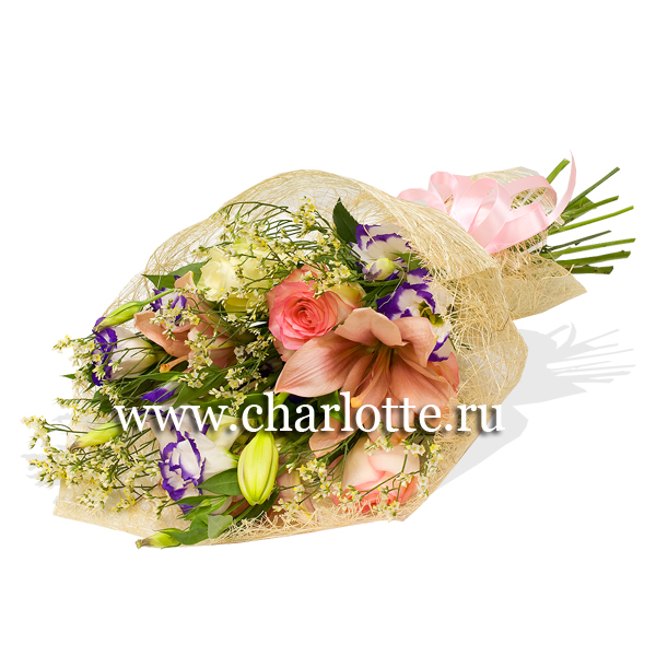 Букет вытянутой формы из лилий, роз, лизиантусов, лимониума (может меняться а гипсофилу) с декоративной зеленью. Цветы оформляются в подарочную упаковку на усмотрение нашего флориста. По Вашему желанию цветовую гамму букета можно изменить, для этого звоните в наши салоны цветов или указывайте в разделе "комментарии для флориста" при заказе через интернет.